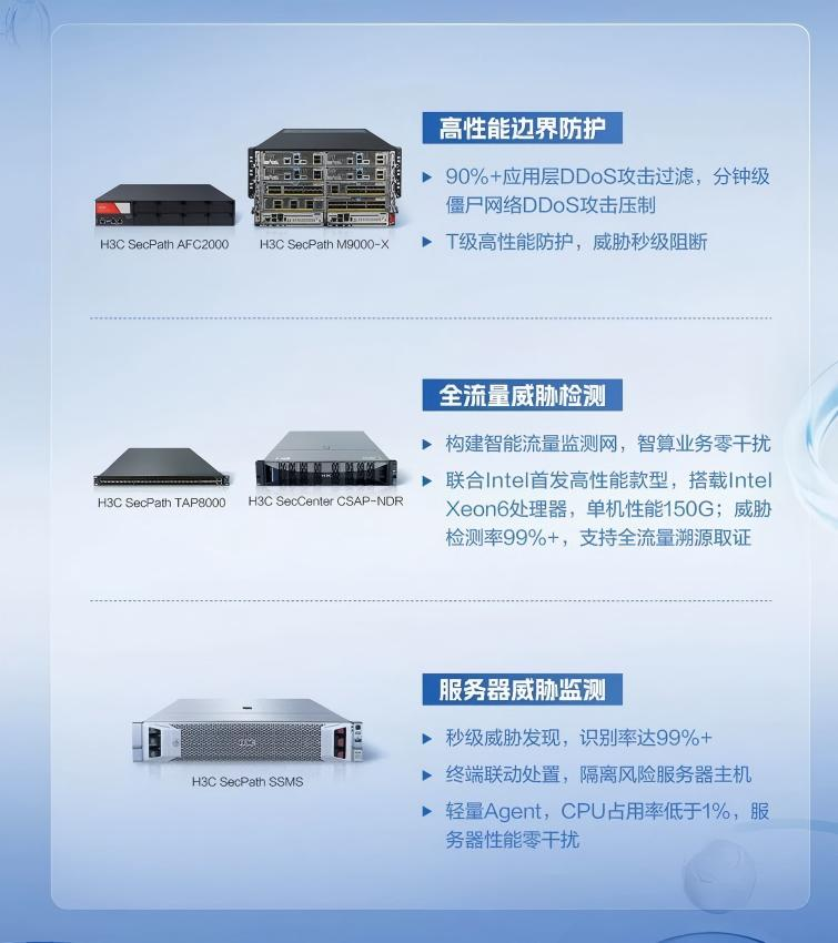 2、全流量威胁检测:引入流量可视化系统H3C SecPath TAP8000构建智能安全监测网,一次引流即可灵活调度,极大降低网络压力,保障智算业务零干扰;同时部署安全威胁发现与运营管理平台H3C SecCenter CSAP-NDR,该平台能精准识别勒索软件、挖矿木马等30余类威胁,通过AI能力将恶意行为检出率提升至99%以上,支持全包存储、溯源取证,且联合Intel首发的NTR方案,内置Intel Xeon6处理器,全流量检测单机性能可达150G,可有效识别加密流量中的恶意程序。