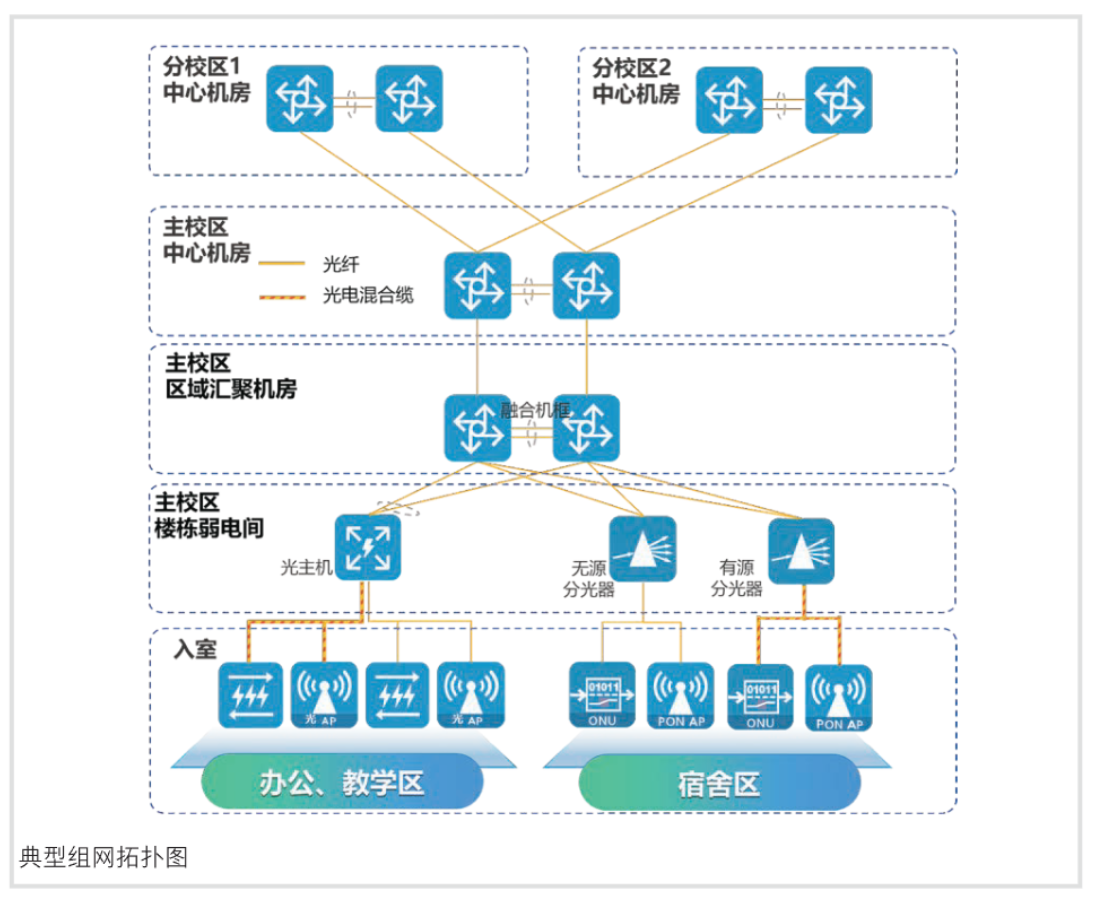 4、结构复杂,不易维护:传统铜缆每百米需增网络设备及弱电机房、空调等,网络结构复杂难管理;校园网络规模扩大、复杂度提升,运维以故障驱动为主,智能化运维手段覆盖率低,应对网络问题缺乏有效手段。