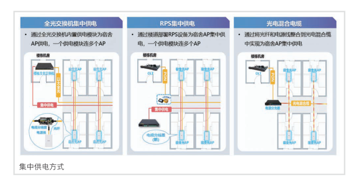 3、集中供电:3、依托新华三方案,有两种方式,一是用交换机内嵌供电模块或单独 PRS 供电设备,单独走弱电供电线缆到受电交换机 / AP;二是通过光电混合缆,整合输电解铜线与光纤,同步解决宽带、用电、信号传输问题。